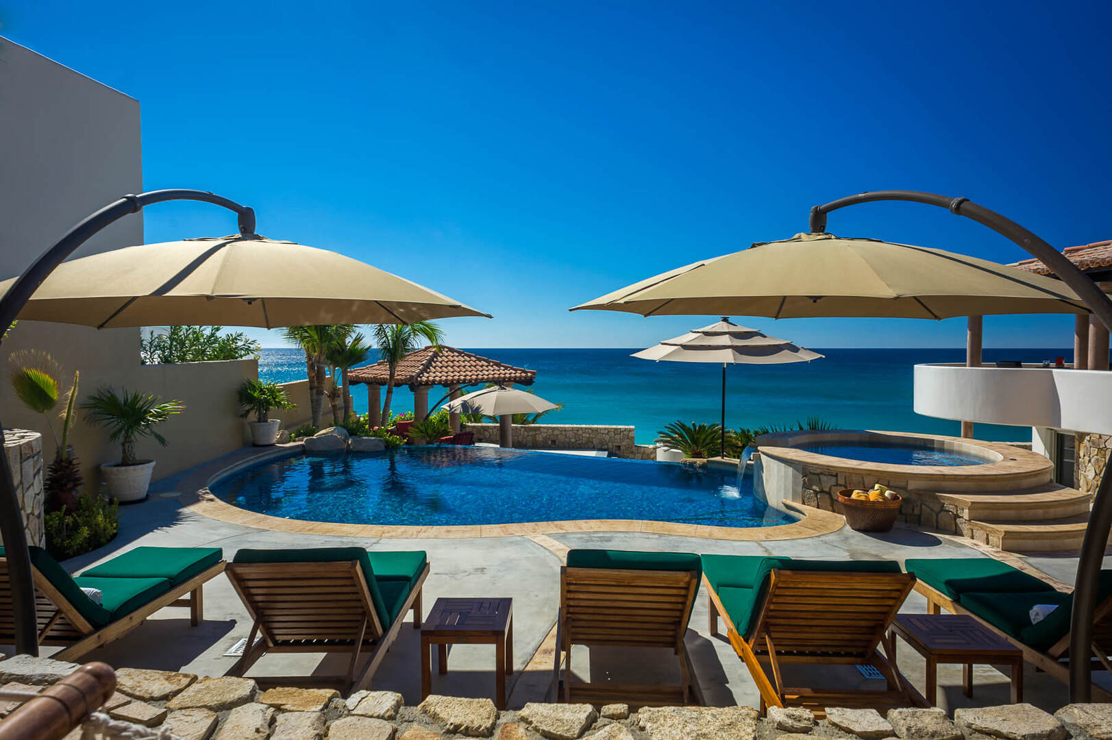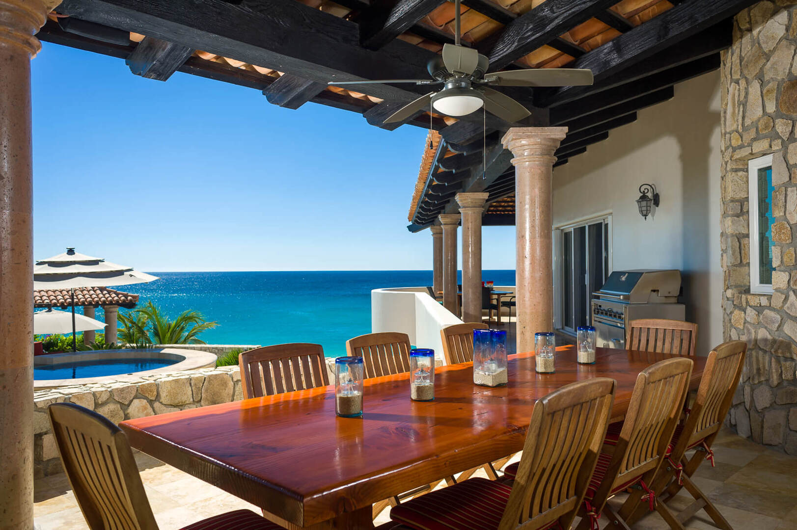 Casa Ocho Chiquita’s outdoor areas are truly magnificent. Guests can entertain outdoors in the pergola-shaded dining area or enjoy a casual barbecue under the palapa hut on the lower deck. Lounge chairs and umbrellas surround the massive infinity pool and elevated Jacuzzi where the golden sands and azure surf of the Cortez coast providing the idyllic backdrop.