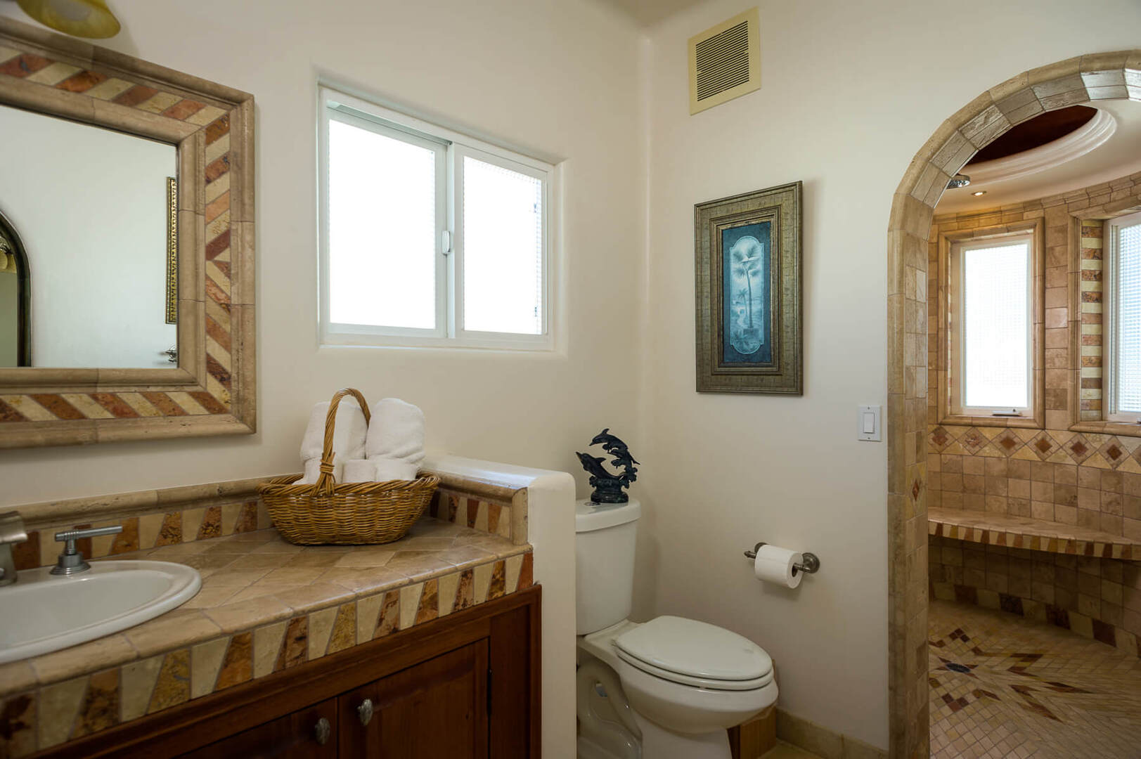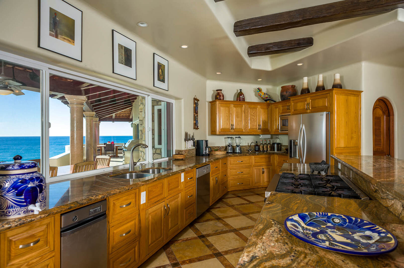 The posh living area is complete with a large wide-screen TV and ultra-chic decor. In the kitchen, gorgeous wood cabinets and marble countertops complement the deluxe stainless steel appliances. A classic wood dining table is located adjacent to the kitchen where you can enjoy a traditional Mexican meal or a 5-star gourmet menu with seating for you and 7 guests.